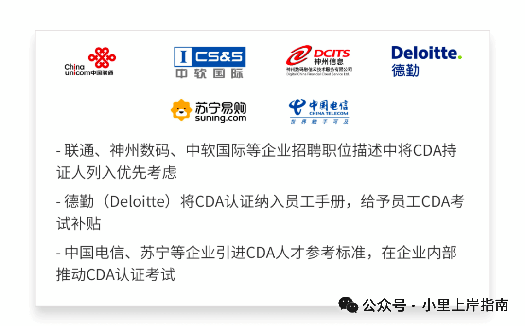 CDA企业承认度很是高,把CDA持证人列入优先考虑或者对员工的CDA测验给补助。是设想院、良多银行、金融机构的手艺岗会要求必需是CDA数据阐发师二级以上的持证人。这个证书顺应了将来数字化经济和AI成长趋向,