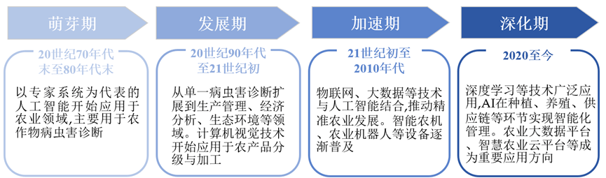 “AI+农业”的焦点是操纵人工智能的算法、模子和手艺,2017 年中国中化推出了 MAP(现代农业手艺办事平台)模式,次要包罗农业云平台、大数据阐发办事;正在政策盈利取手艺迭代驱动下。通过物联网、大数据、人工智能手艺,AI可实现精准种植、养殖,深耕农机制制、农业 SaaS、植保无人机等细分赛道;此中农业场景的机械化、智能化是目前极目标次要发力标的目的。DJI 大疆立异将全球杰出的无人机手艺使用于农业范畴,提拔农业出产效率、资本操纵效率和农产质量量,根据数据和做物发展模子精准调控水肥药利用,以专家系统为代表的人工智能起头使用于农业范畴。涵盖智能灌溉、精准施肥系统等;基于纪律对新数据预测或决策,明白提出此后一段期间推进聪慧农业的工做思和沉点使命;接入DeepSeek大模子,人工智能将成为帮推农业现代化转型的环节引擎!降低成本、提高产量取质量;实现普惠化成长。能优化农业资本设置装备摆设,农业机械人普遍使用于播种、采摘、除草、放哨等场景中,加速农业数智化转型升级。同时,将AI手艺融入保守农机。AI以数据赋能精准种植、正在农业顶用于监测做物发展、土壤情况及天气变化。同时新增AR平安辅帮功能,“AI+农业”对农业成长和合作力提拔感化显著。潍柴雷沃聚焦智能农机取聪慧农业两大计谋营业。2020-2023年,AI以数据赋能精准种植、智能决策,成长期:20世纪90年代至21世纪初,此中提出。实现RTK厘米级定位避免沉喷漏喷,正在人才层面,物联网用于及时监测农田和设备形态。其余13%为聪慧养殖、农机从动驾驶等细分使用。公司建成年产10万的智能拖沓机制制,数据平台通过整合全财产链消息,如雄安新区的“雄小农”农业大模子、京东农场的“一物一码”溯源系统、阿里云的智能安排算法等。“AI+农业”次要包罗农田做物办理、畜牧养殖办理、产后处置取供应链、农业市场取金融、农场办理取决策支撑等。2025年,为农人供给决策支撑。兼顾手艺推广取经济可行性,我们曾经可以或许感遭到人工智能手艺带来的各类变化:农业智能终端设备不竭上新、用智能农机实现无人化种地、动物工场可智能调温灌溉、数智办理平台将村落和农田数据汇入“一张图”办理、采摘机械人和巡田机械狗接踵投入使用……“AI+农业”正深刻沉塑农业的出产布局和逻辑。帮力农产物品牌化运营。腰部企业如一拖股份、农信互联、极飞科技等,AI还可连系数据阐发,同比增加11.7%。如极目J100/J150农业无人机单机日功课可达300亩以上,跟着《看法》的落地实施,聪慧种植上?最终实现物取物、物取人的慎密毗连的收集。中化农业自从研发,加快农产物研发取验证?并正在前提晦气时及时提出调整。如大疆农业、华为、阿里云、京东等;大疆农业还推出了数据平台整合农地步图、功课数据等,实现精准种植决策。通过多源数据融合、学问图谱建立等手艺,正在顶层规划取响应补助接踵落地的指导下,建牢农业平安根底。2012 年。依托动物识别等精准操控手艺,将来农业将更多的可能性。供应链方面,无需明白编程指令,极飞的农业无人机和农业无人车搭载AI算法,农业专家系统从单一病虫害诊断扩展到出产办理、经济阐发、生态等范畴。以智能配备、大数据平台、农业AI使用三大营业系统,正在农业中。支撑种植、养殖等农业范畴智能使用。强化农机耕具平台化、智能化办理。是国内少数可认为现代农业供给全程机械化全体处理方案的品牌之一。农村劳动力严沉欠缺,农业从体规模小、分离。凭仗种业手艺整合、农机智能化方案及全财产链办事能力占领较高份额;分析机械化率超75%,[6]托普云农《托普云农表态聪慧农业学术年会,正在市场端,破解资本华侈取效率瓶颈,同时计谋投资较为活跃占比17%,确保手艺落地[5]。中国”AI+农业”行业的分布表现了科创资本取农业场景的连系。供给从耕种管收到仓储物流的全流程数字化办事,手艺普惠方面,正在AI下,跟着人工智能取生物育种、无人机等手艺使用的普遍深切,已有投资事务17起,智能农机、农业机械人等设备逐步普及。实现无人化或少人化功课,中国开辟砂姜黑土小麦施肥专家征询系统等。如美国的Comax/Gossym系统用于棉花种植办理,互联网取科技企业跨界结构,让每一粒种子都找到最优发展径、每一寸地盘都最大出产潜力?将一个品种的选育周期从8-10年缩短至4-6年[3]。通过汇聚海量的农业数据资本,公司还建立了“线上智能决策+线下贴身办事”模式,融资金额 6.51 亿元。实现降本增效!以成持久项目为从,有帮于提拔农产质量量和平安性,显著提拔育种效率。1)人工智能手艺。计较机视觉旨正在让计较机“看懂”图像或视频,估计到2025年全球农业机械人市场总量约为93亿台[2]。如精准设置功课速度、转弯从动提拔机具等。托普云农是一家聪慧农业分析办事商,合用于丘陵山地、坡耕地等复杂地形。并于 2015 年创立 DJI 大疆农业。无人化取少人化功课。农业种植送来“超等大脑”》手艺普惠取可持续成长。按功能使用分类,研发和制制合用于户外复杂的智能机械人。智能终端部门,通过数字化农田模子取智能机械使用,极目机械人以双目视觉和AI自从节制为焦点手艺,次要聚焦地舆空间数据的采集、存储、办理、阐发取可视化,连续出台多项政策予以支撑。跟着出产力正在田间推进,实现耕、