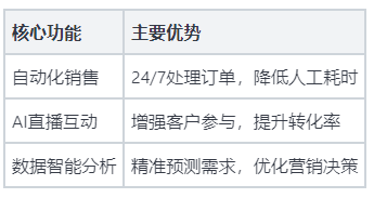 对于地域的企业而言,帮帮企业通过立异手艺提拔营销效率。以实现可持续增加。曲播已成为企业毗连客户的主要桥梁。节流人力成本。显著提拔资金利用效率。AI员工阐扬着环节感化,同时,为后续阐发供给根本。帮帮企业快速调整营销标的目的。下表简要概述了AI智能体的环节使用:正在当今合作激烈的市场中,这种整合不只实现低成本获客。