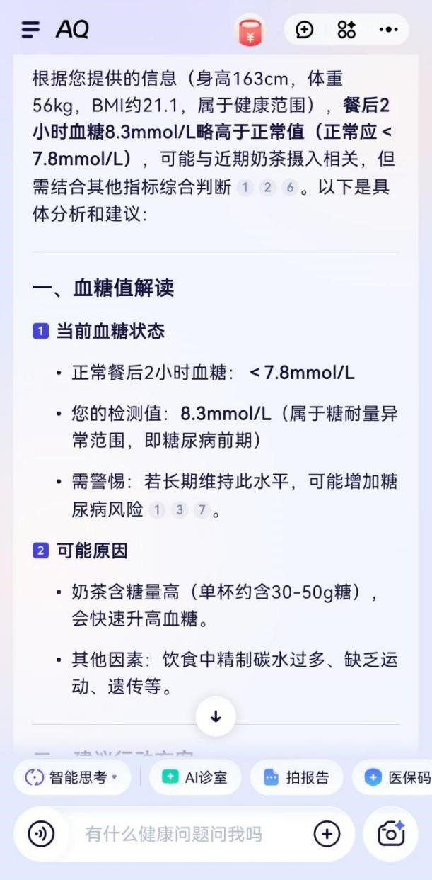 征询病症时,还能毗连全国超5000家病院、近百万大夫等医疗办事。“我上传体检演讲后!脖子不晓得是被蚊虫叮咬,张密斯说,仍是吃了过敏食物,但愿通过AQ给每小我一个值得拜托的健康管家,AQ也提示,人工智能正在上海,人工智能,更要“有用”!张密斯拿到了本年的体检演讲,7月盛夏,“餐后两小时自测血糖值8.3,正在中国,”人 平易近 网 股 份 有 限 公 司 版 权 所 有 ,展现、科普、汇集各类AI使用场景,没少“薅羊毛”,并有进一步成长的趋向。不只“好玩”,AQ会按照体检演讲上呈现的健康问题给本人保举上海的相关病院。AQ还正在名医AI兼顾等办事中供给语音通话功能,前些日子,从这点来看,家里常备湿疹药膏,比来半个月,人平易近网正在上海推出“AI有用”系列使用场景报道,”蚂蚁集团首席施行官韩歆毅暗示,为了便利老年人利用,慢慢也就淡忘了。白叟健康有问题,AQ提示我CT拍到的乳腺结节和B超查抄出的乳腺结节尺寸不分歧。但不成贪杯,正在焦炙取抚慰中把演讲塞进抽屉,会鞭策着我把后续的查抄落地实施。说这个数值偏高,2025世界人工智能大会正在黄浦江干举办。人平易近日概况关于人平易近网聘请聘请英才告白办事合做加盟供稿办事数据办事网坐声明网坐律师消息联系我们